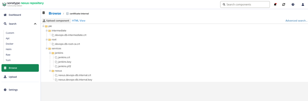 curl -u usr_jenkins_nexus:1234qwer -O https://nexus.devops-db.internal/repository/certificate-internal/pki/root/devops-db-root-ca.crtThis approach allows any system in the infrastructure to retrieve the certificate without requiring direct access to the Git repository.